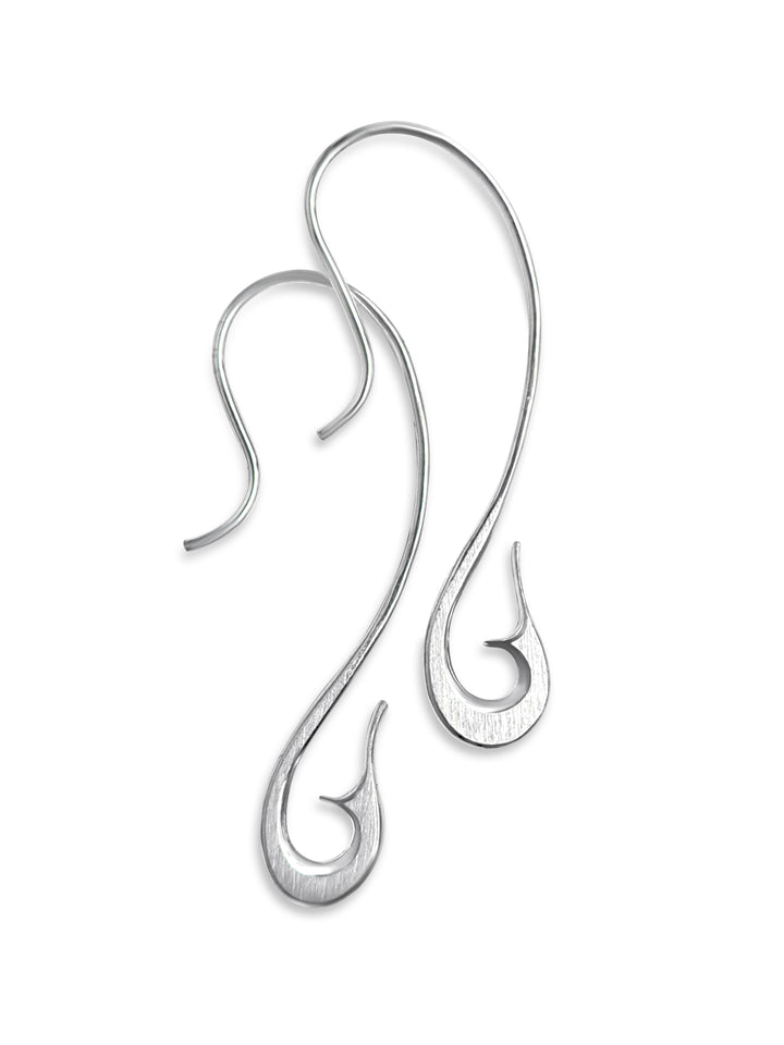 Sterling silver earrings in a long stylized hook shape. Dimensions are 40 x 15 x 2.5mm.