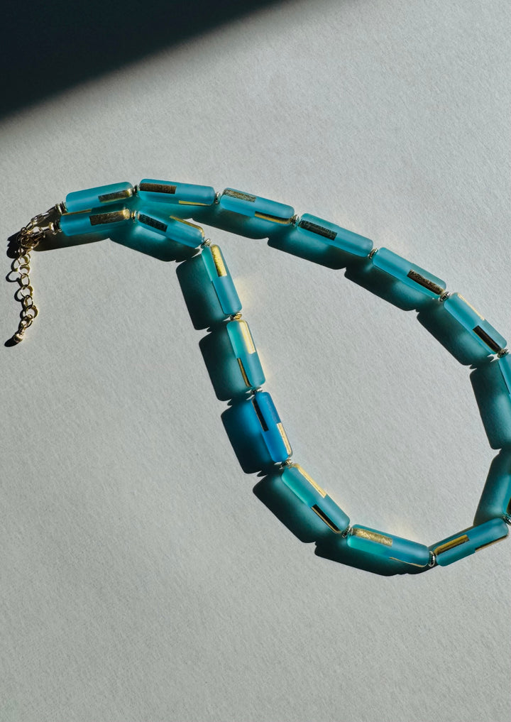 Gold Line Necklace in Blue. The 24k gold leaf details catch the eye against the soft blue-green glass beads. Finished with a 14K gold fill clasp, it is 55 x 0.5 cm.
