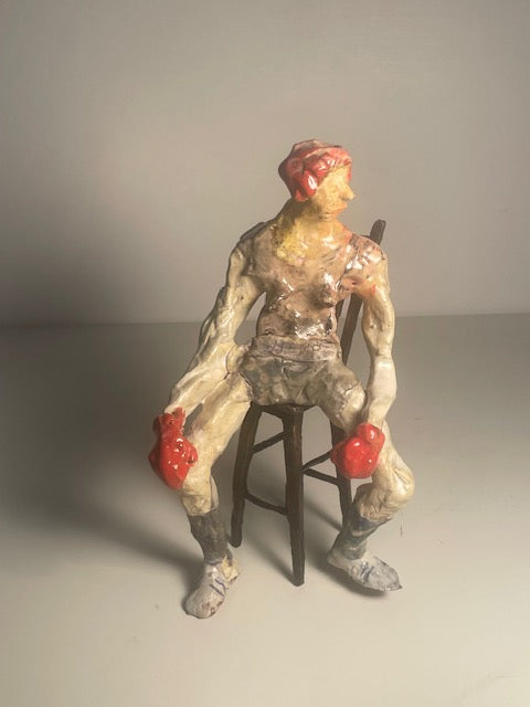 Seated Boxer. 2025. 9x6x4”. Glazed stoneware and bronze. A ceramic sculpture of a seated boxer with red boxing gloves.