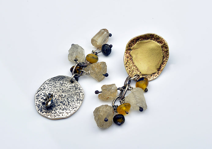 Amber Lights, earrings; Brass front, 925 Silver back, Raw kunzite and Amber. Hand textured and fabricated oxidized patina; 2”X 0.75” ; 2023.