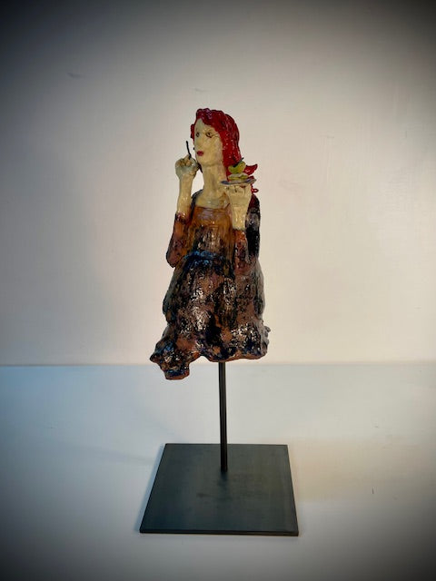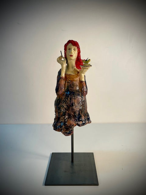 Pickle? 2025. 16x6x6. Glazed stoneware on steel mount. A ceramic sculpture of a redheaded woman sitting down and holding a pickle.