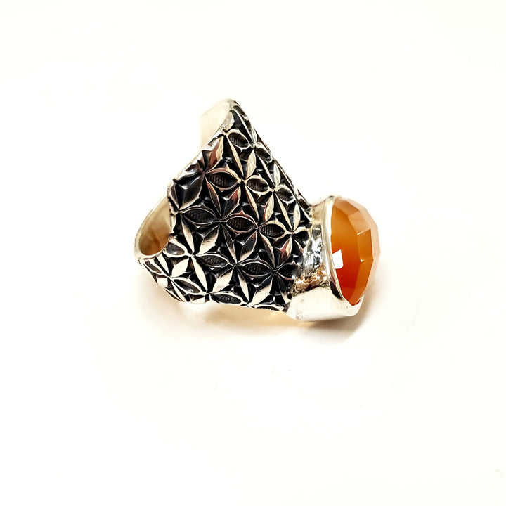 This handsome wide sterling silver ring features an oval carnelian and a handstamped geometric pattern created with the artist's own handmade metal stamping tools. The hollow, domed shape gives the ring visual impact, and the rounded interior creates a comfort fit. The ring size is 8.