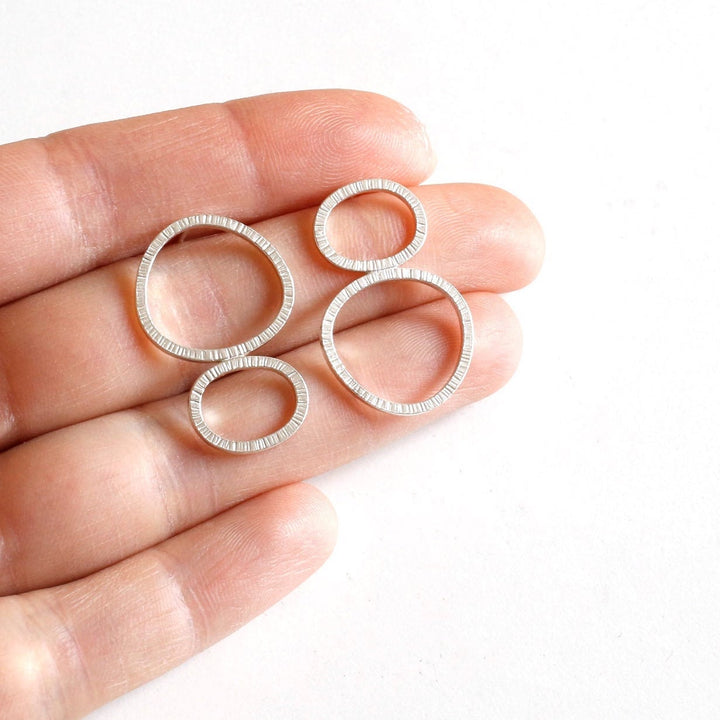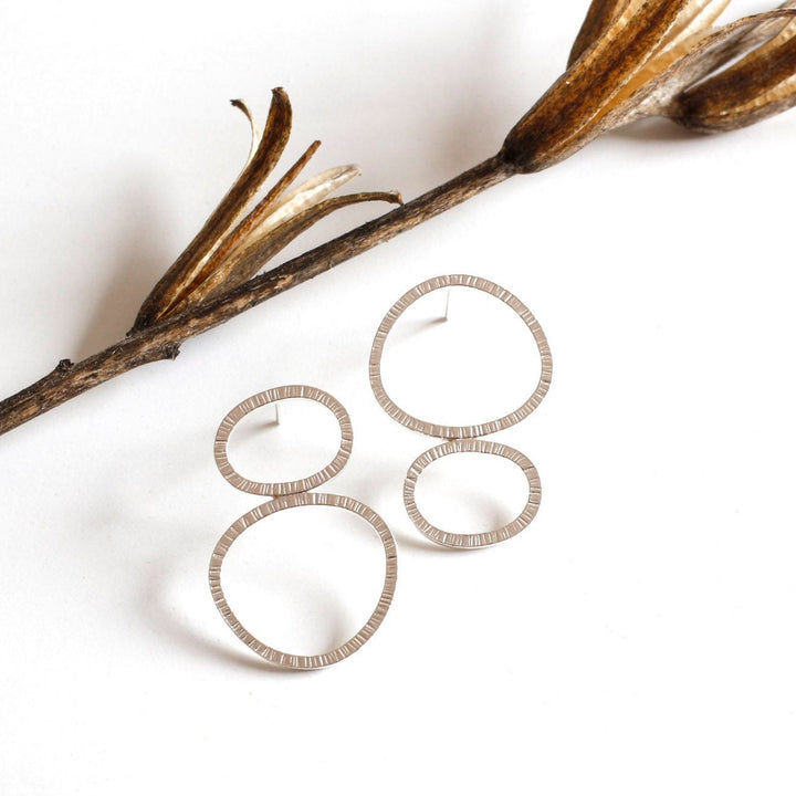 Minimal and elegant stud drop earrings shaped as stacked textured hoops.