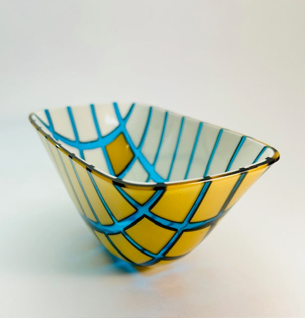 Small fused glass bowl in an interesting squared oval shape, measuring 18x10x8cm.