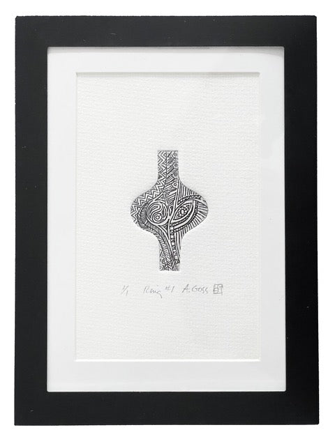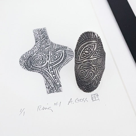 Etched sterling ring #1A is doubly a one of a kind piece: both the ring itself and its accompanying framed original print (1/1). The shapes and the swirling lines within are inspired by rock or boulder forms. The ring is size 7, and measures 25 x 44mm.