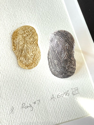 Etched sterling ring #7 is doubly a one of a kind piece: both the ring itself and its accompanying framed original print (1/1). The shapes and the swirling lines within are inspired by rock or boulder forms. The ring is size 6.5.