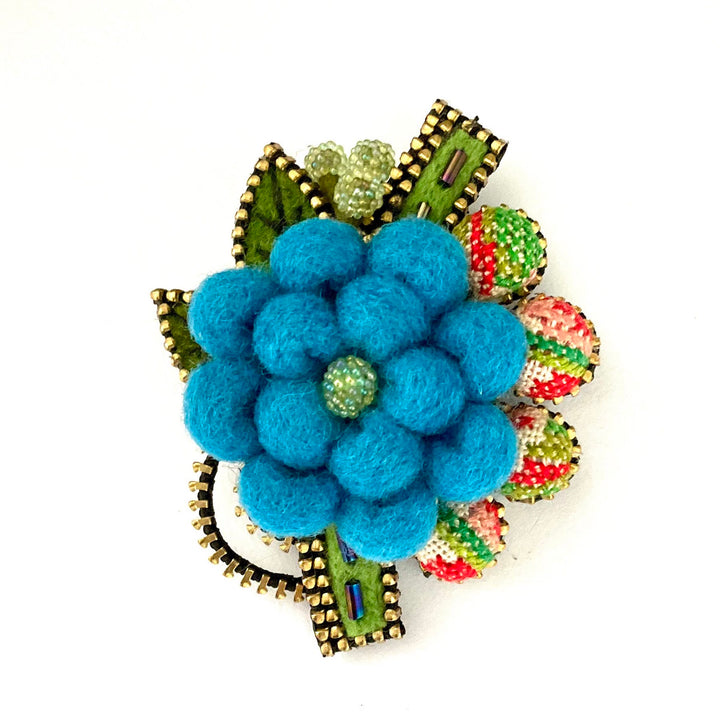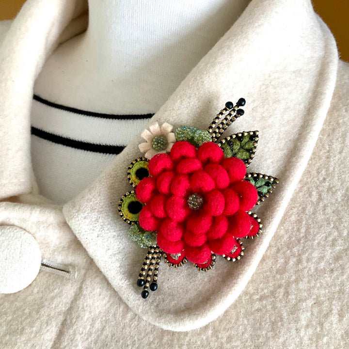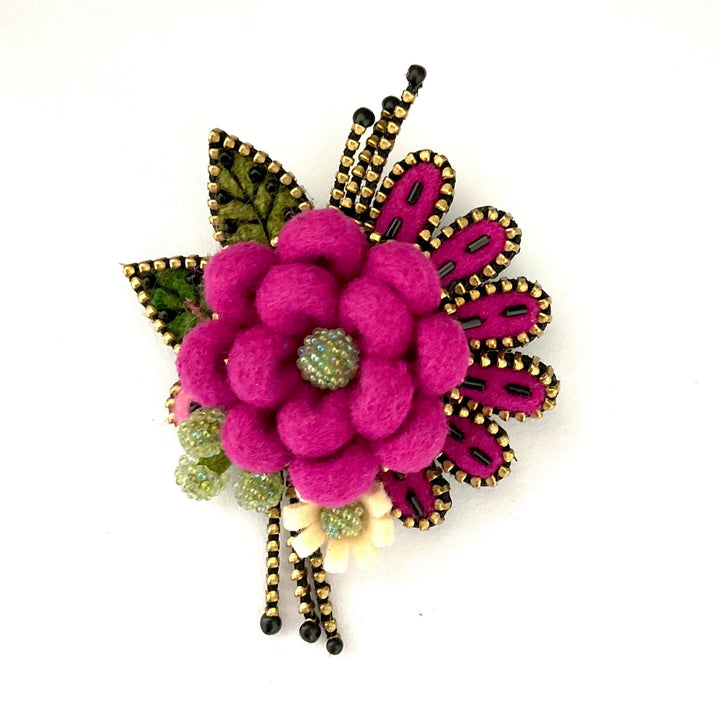 This brooch features a central flower, paired with a bouquet of felt and bead details. Brooch measures approximately 2.5 x 3".