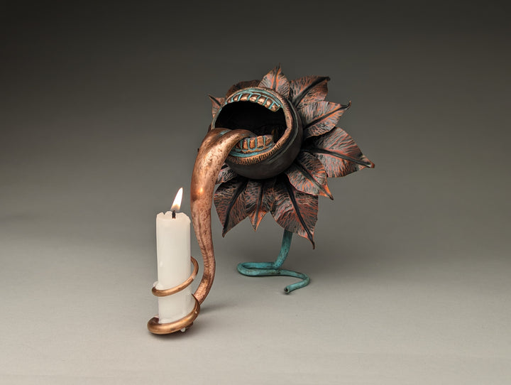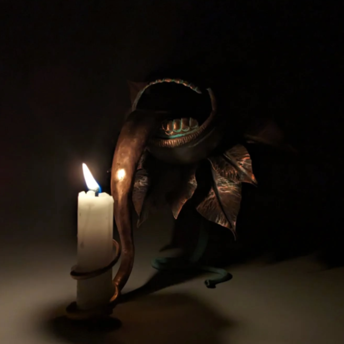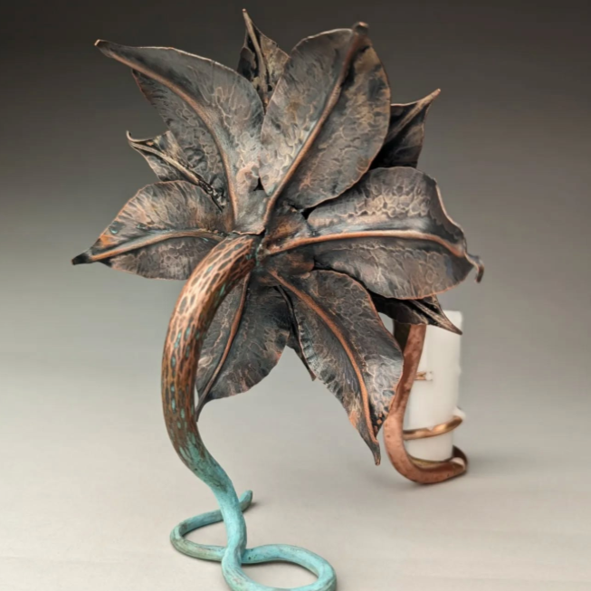 This candle holder is made of copper. 17 x 15 x 18cm.