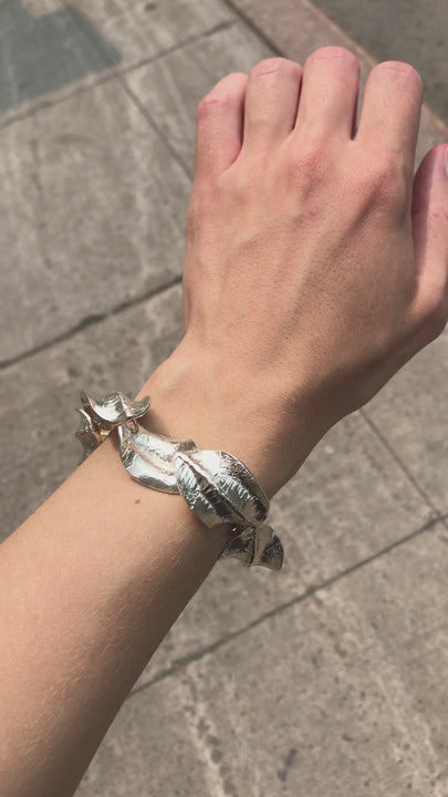 Leaf bracelet of sterling silver with texture and folds created through hand forging. Fits a size small.