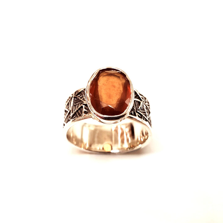 This handsome sterling silver ring features a faceted oval carnelian and a handstamped geometric pattern created with the artist's own handmade metal stamping tools. The hollow, domed shape gives the ring visual impact, and the rounded interior creates a comfort fit. The ring size is 9.