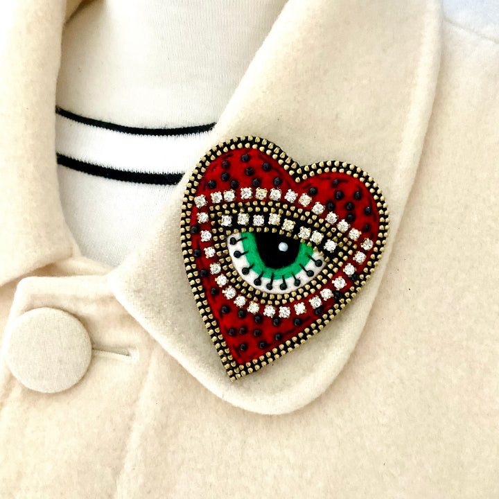 This brooch depicts a red heart with an eye at its center. Brooch measures approximately 2 x 3".