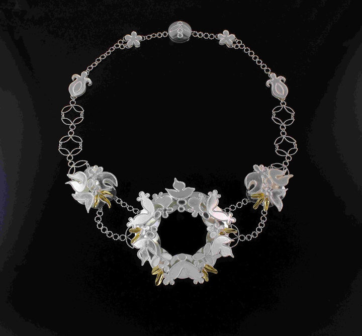 ‘Ice Dancers’ - a midwinter’s night reverie. Sterling silver, pearls, 24 k keum bu (24 k gold overlay on fine silver). Hand fabricated, with cast elements soldered in place. The central pendant is 9 cm W x 8.5 cm H x 2 deep. Laid flat, It is 19.5 cm W x 24.5 cm H x 2 cm D with a total length of 57 cm.