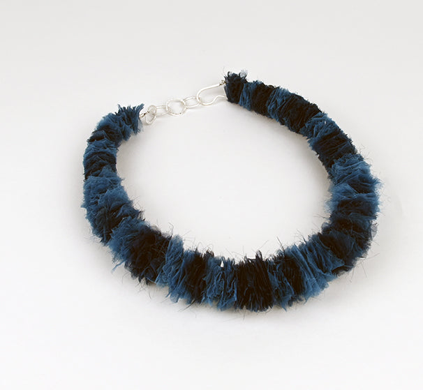 Currents Series 1, Hand fabricated and hand dyed Indigo Silk Organza necklace; 925 Silver, 18”, 2025