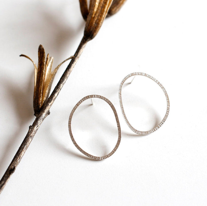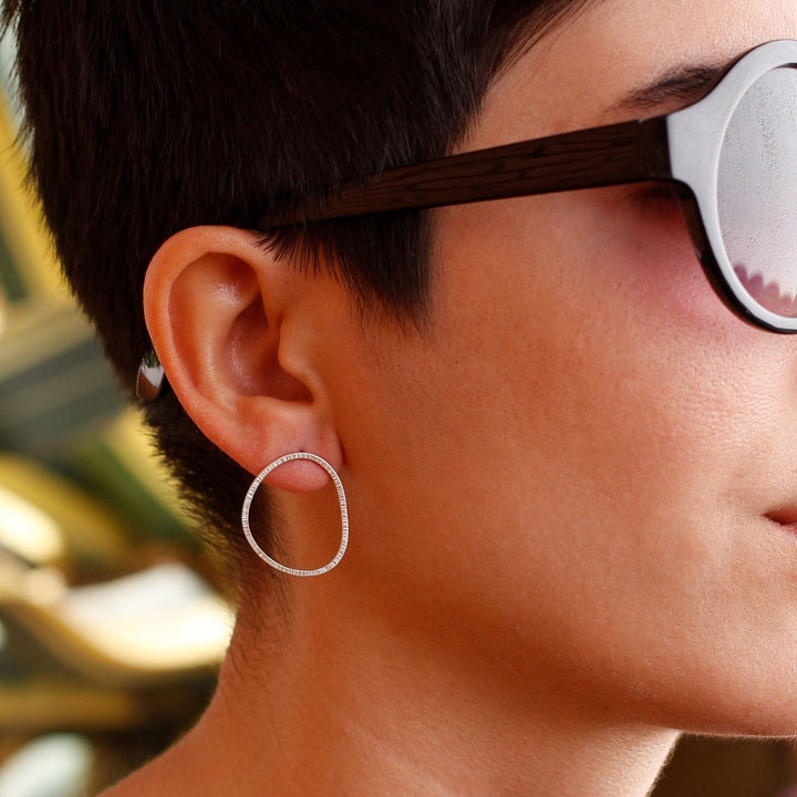 Minimal and elegant studs shaped as textured hoops are available in three different sizes.