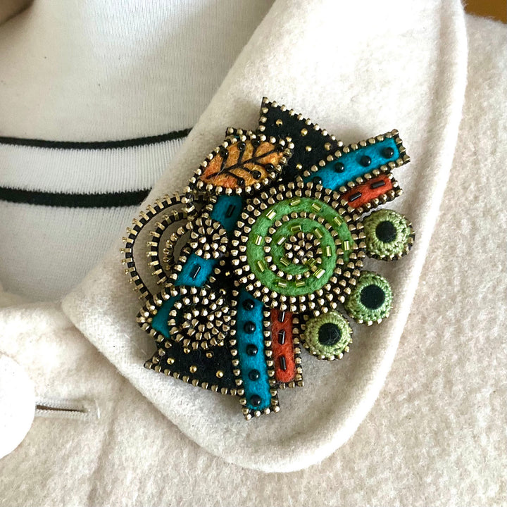 Odile Gova's decorative fibre brooches have been knitted with Noro Kureyon wool from Japan, a material that is thick and strong enough to handle the weight of the zipper chosen. The artist developed two interesting techniques of making felt rope and felt beads which are incorporated. Each element, including each bead and rhinestone is sewn in twice, so the brooch lasts--it is firm and resistant.