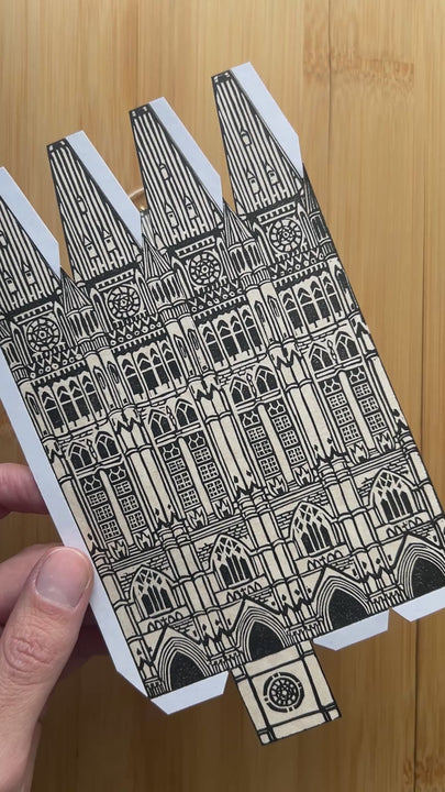 DIY: Linocut printed ornaments of Ottawa’s Peace Tower. Once assembled, they measure 1” wide and 6.5” tall. They also make charming freestanding objects for year-round.