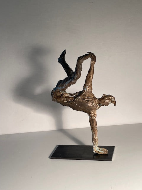 Breakdance. 2025. 11x6x3”. Glazed stoneware with steel mount. A ceramic sculpture of a person breakdancing.