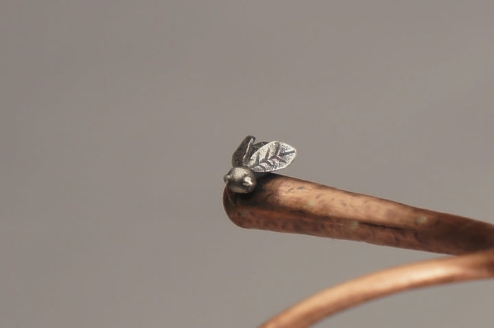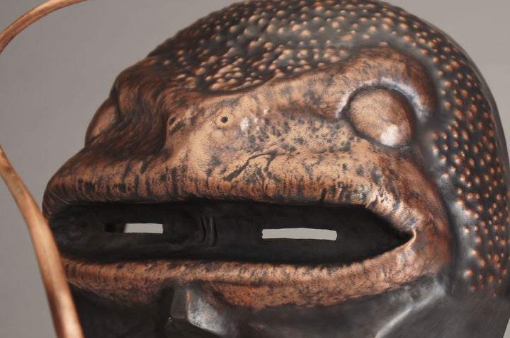 Created with hand fabrication, chase and repousse, and spiculum forming, this wall mask is made of copper and recycled silver.