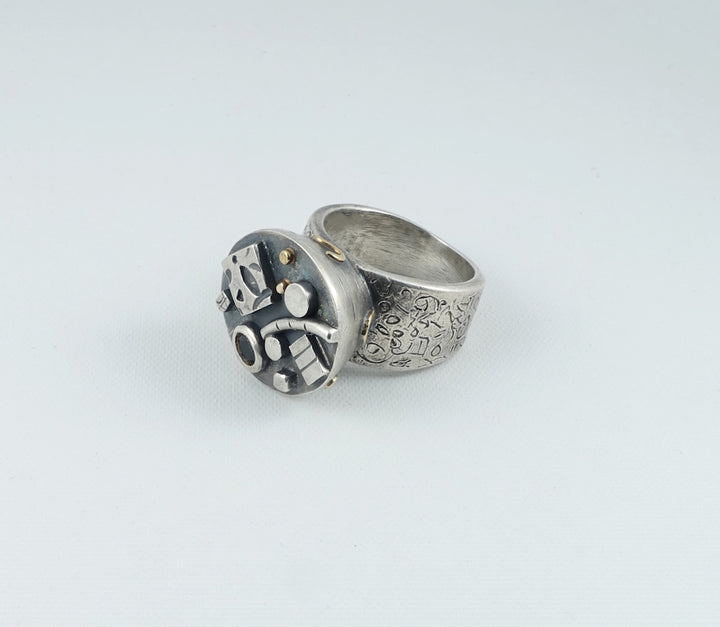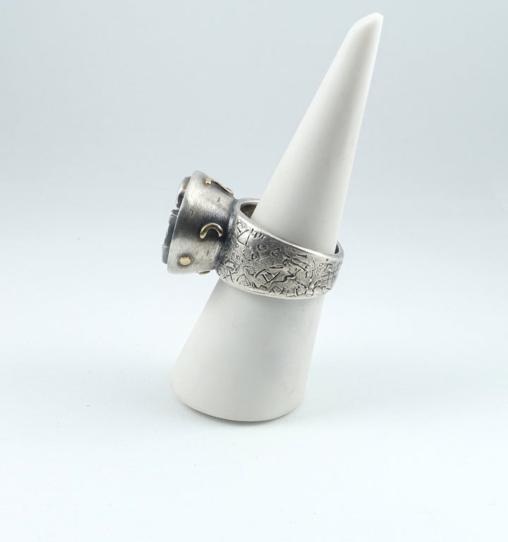"One Of A Kind" detailed chunky hand-etched ring in sterling silver with black oxide and gold details of 14k and 18k. A single dark sapphire stands out amidst the unusual composition of elements. Size 7.5.