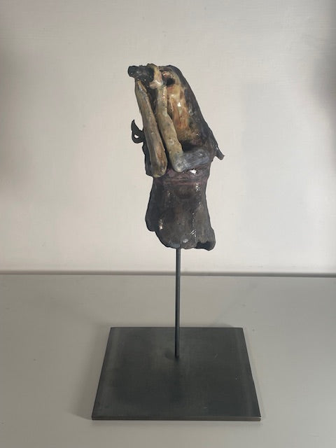 Chanteuse. 2025. 13x6x6“. Glazed stoneware on steel mount. A ceramic sculpture of a woman singing.